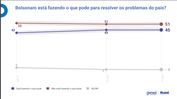 A rejeição do Bolsonaro segue sem mudanças, embora a avaliação do governo tenha uma sutil melhora.