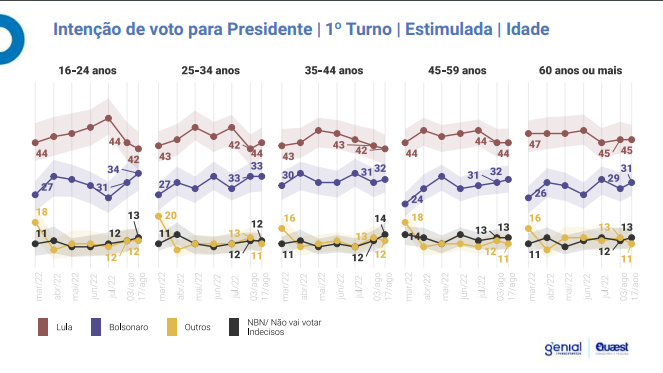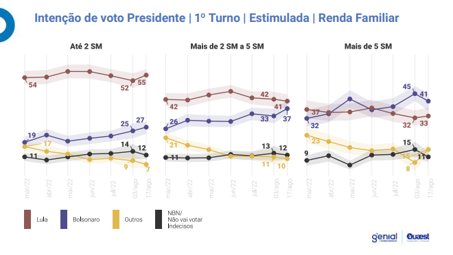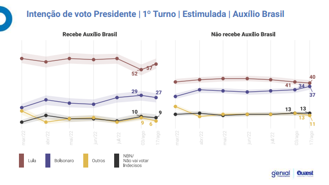 A intenção de voto em Lula entre os beneficiários do AB cresceu 5% enquanto Bolsonaro perdeu 3%