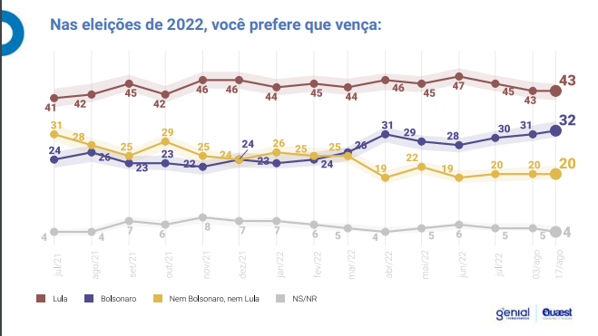 Porém, há uma clara maioria para Lula quando os eleitores são perguntados sobre quem preferem que vença as eleições.