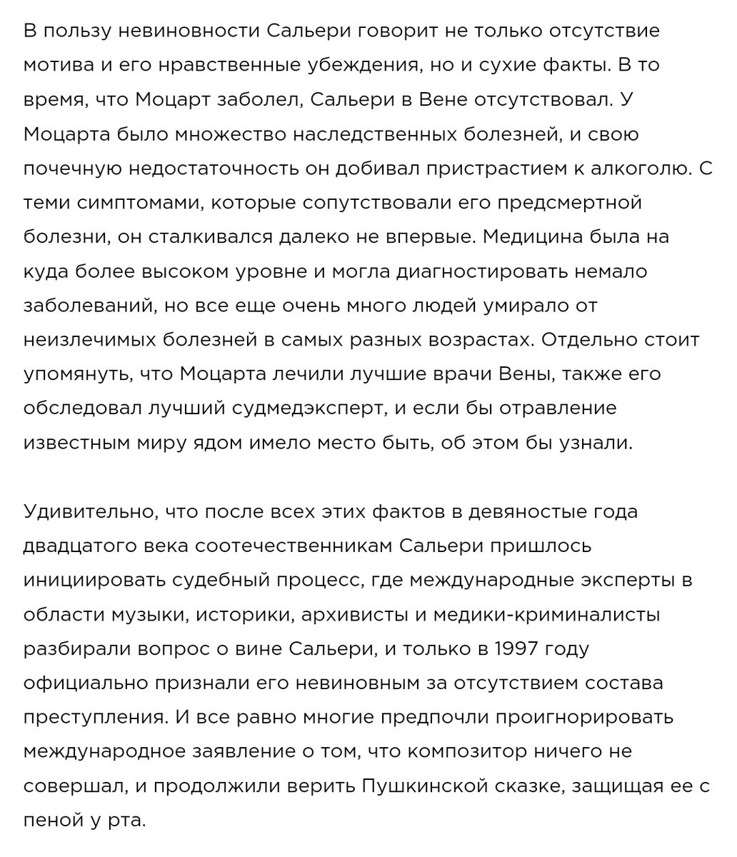 Тут не буду долго распинаться о причинах того, почему Сальери игнорировал обвинения в убийстве Моцарта, но Сальери Моцарта не травил. Вот отрывок из моей старой статьи на эту тему, так сказать с предельно объективными фактами для тех, кому все равно на презумпцию невиновности: