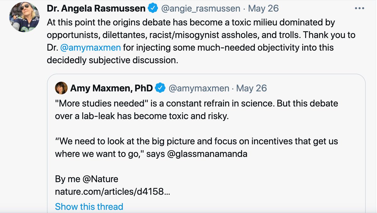 coming from any of the major discussants in the Covid origins debate, who are fellow scientists and science journalists. On the other hand, Rasmussen herself has been the single most toxic presence in this debate, as illustrated by this early Tweet (see screenshot.)