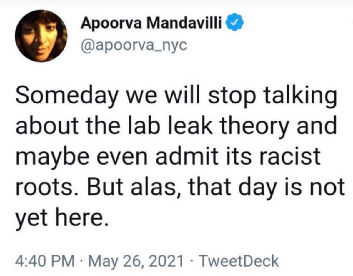 @nytimes basically calling anyone who thought a lab-leak was possible a racist (see attached screenshot, a Tweet by @apoorva_nyc that she soon deleted; she has never written about Covid origins for the Times since.