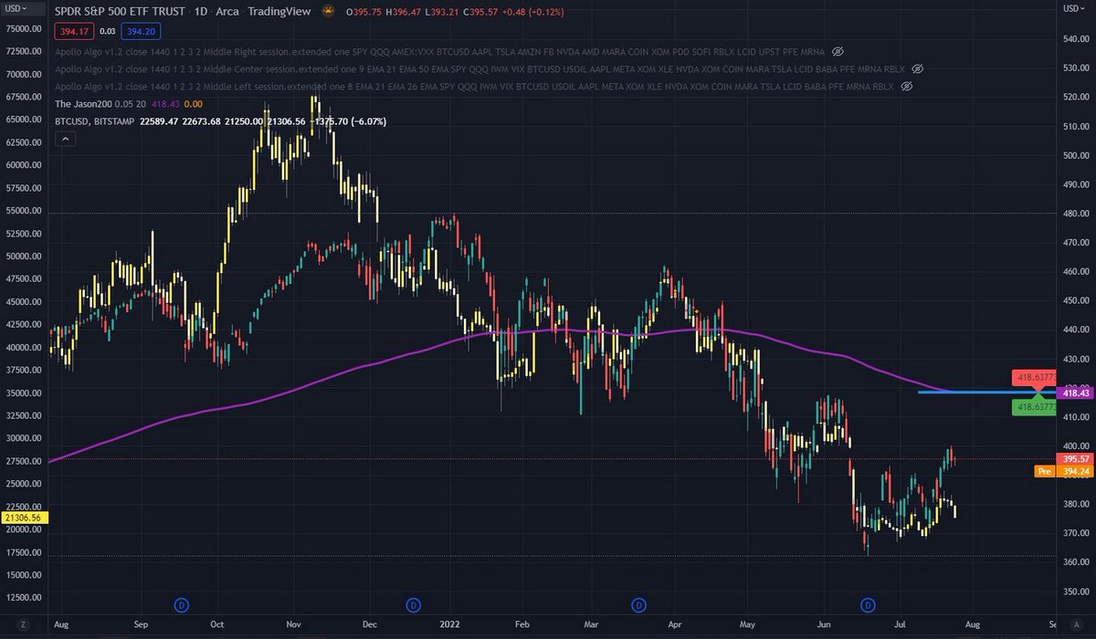 1/ For reference; here is a $SPY & $BTC overlay, I think the chart speaks for itself. What happens to one, happens to the other. The data is relatively interchangeable.