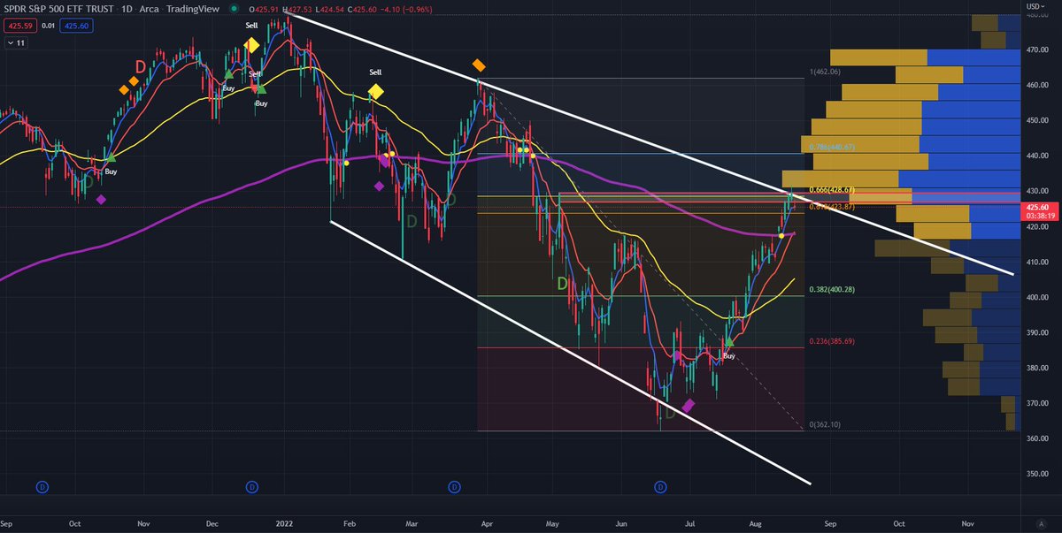 4/ $SPY rejected this confluence point in this supply zone, Fibonacci golden pocket, upper resistance band of falling wedge and volume shelf. FOMC minutes today will result in a big move, potentially hawkish.