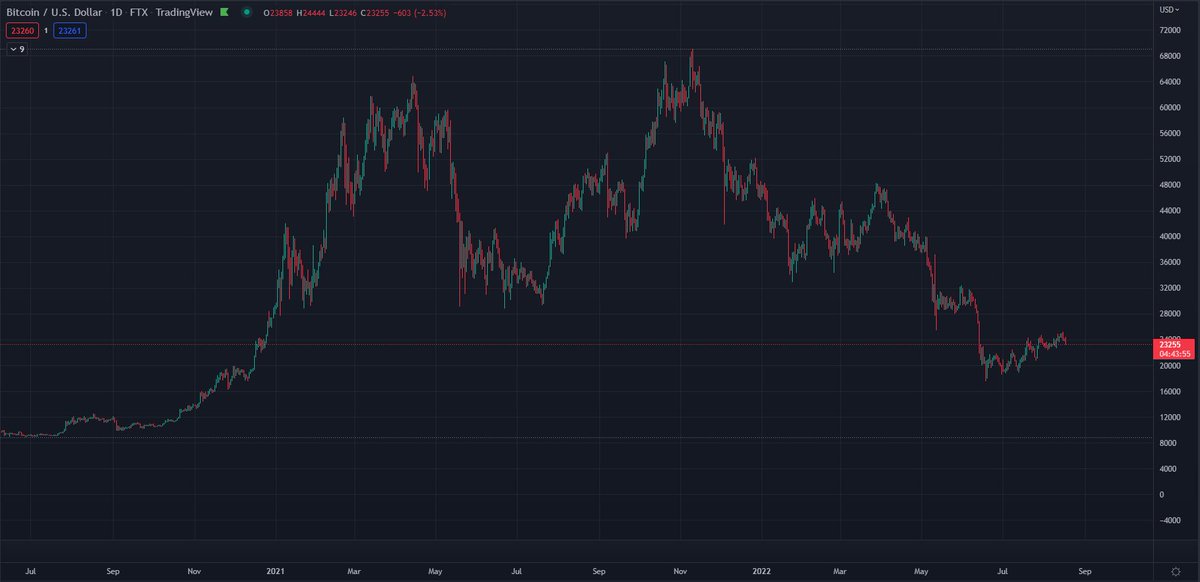 2/ Since Dec '21 we keep seeing the same pattern of consolidation range, fakeout pump to trap liquidity, then dump into another leg down; rinse & repeat. Historically new ATH retrace is 85% which puts us around 10k.