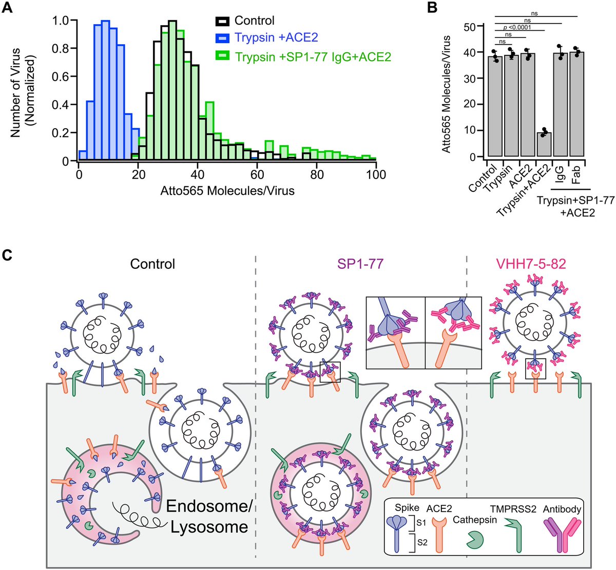 Domäne des Spikes anlagern. Der SP1-77-Antikörper bindet ebenfalls an die rezeptorbindende Domäne, allerdings auf eine andere Art und Weise, die das Virus nicht daran hindert, an ACE2-Rezeptoren zu binden. Wie würde er uns also schützen? Sobald das Virus an ACE2 gebunden hat,…