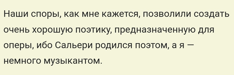 Когда он писал свое первое либретто под крылом Сальери, он его Сальери принес, Сальери прочитал, сказал типа "вообще молодец все хорошо я только пару правочек внесу чисто для музыкальности а так все хорошо". И короче за ночь переписал половину текста.