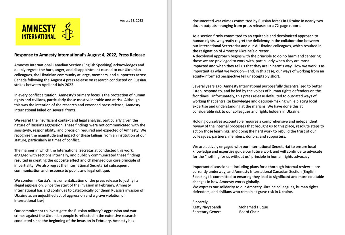 BREAKING: 🇨🇦 Canadian branch of Amnesty International blasts leadership over Ukraine report which “failed on several fronts,” had “insufficient context and legal analysis, particularly given the nature of Russia’s aggression.”