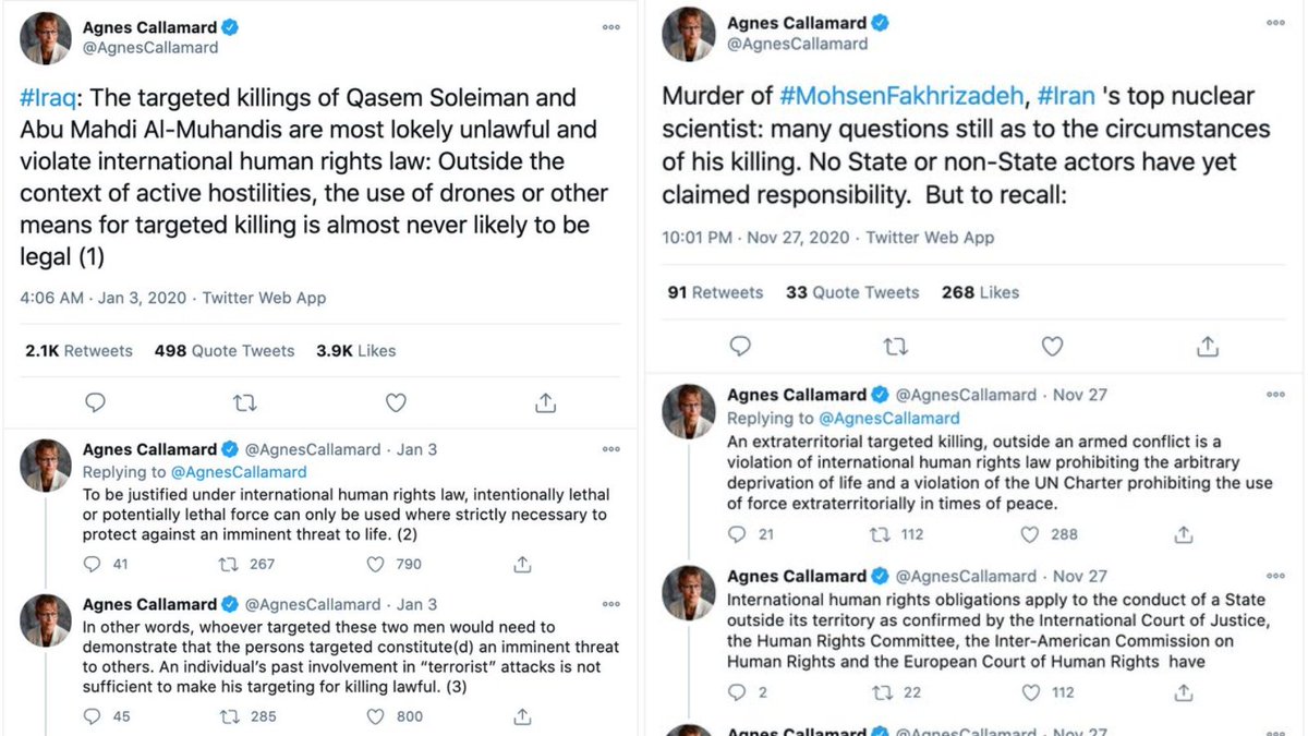 When Iran's Islamic Revolutionary Guard Corps commanders Qassem Soleimani & Mohsen Fakhrizadeh were killed, @AgnesCallamard, then a U.N. official, sprang into action within minutes of their deaths to condemn their killings as “illegal.” A week after Rushdie's stabbing—silence. /2