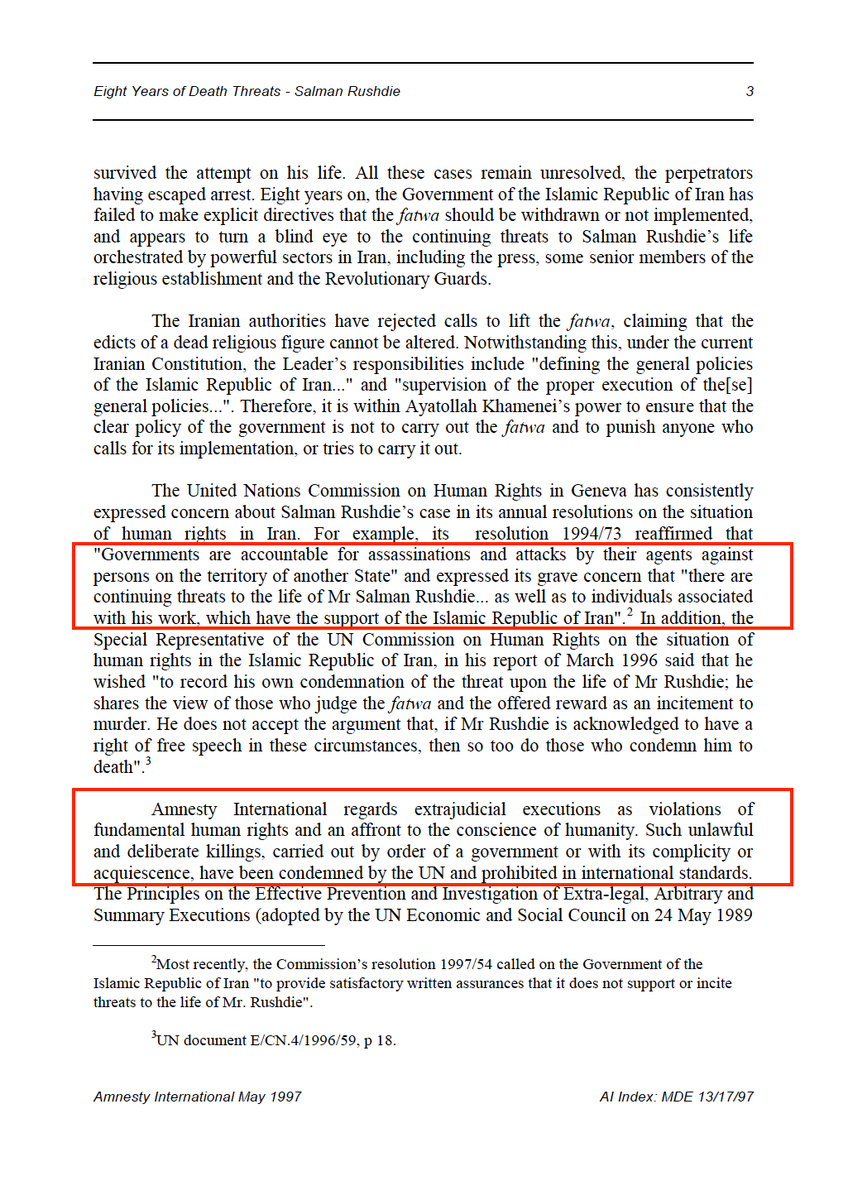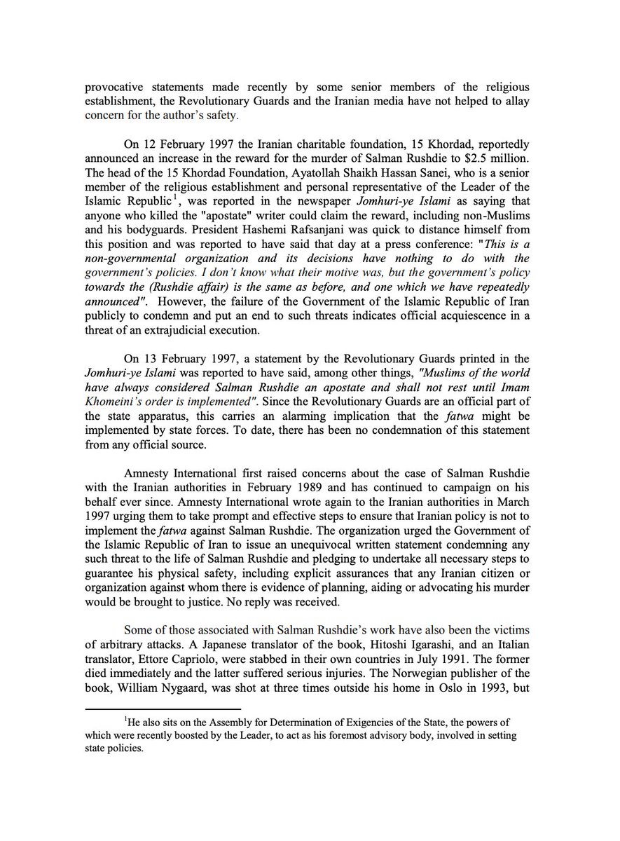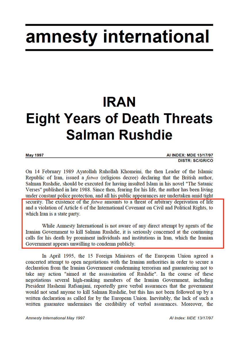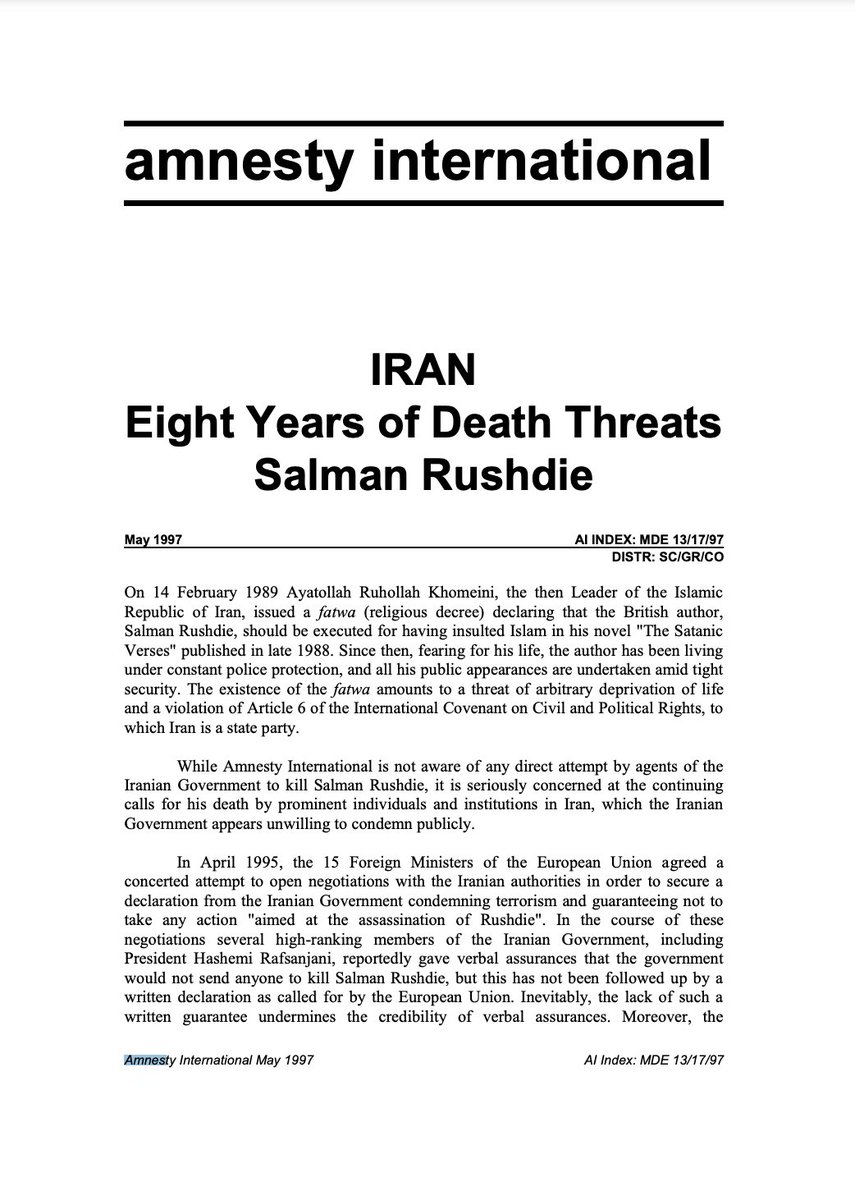 One would expect Amnesty International, its leaders & country chapters to react to the stabbing by clearly condemning the Islamic Republic of Iran's fatwa to murder Salman Rushdie as a violation of international law. That's what old Amnesty did in 1997: amnesty.org/en/documents/m… /7