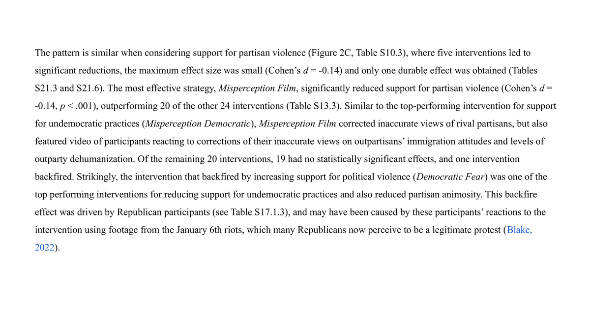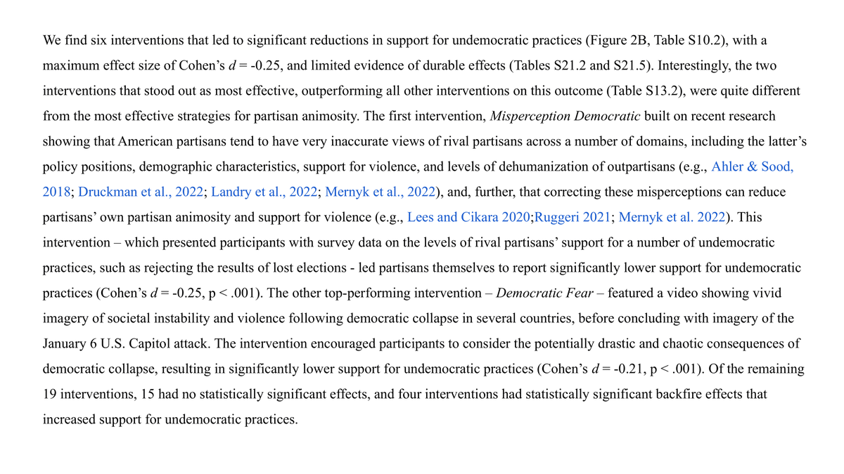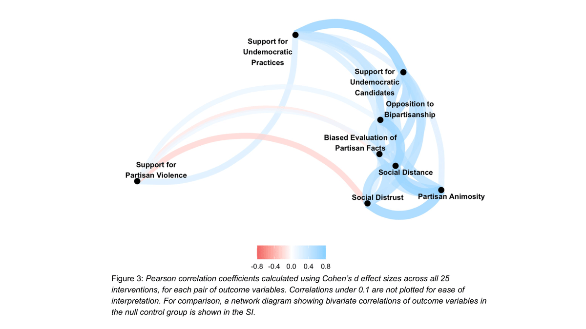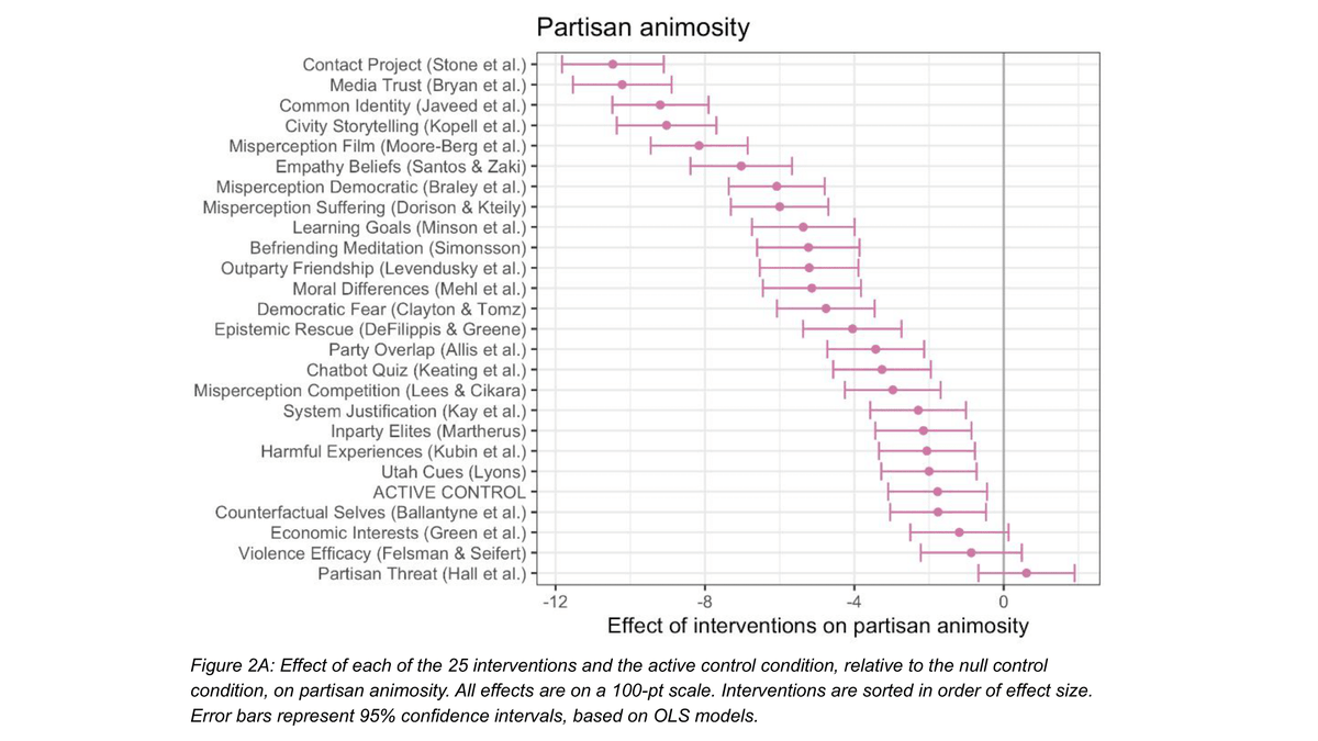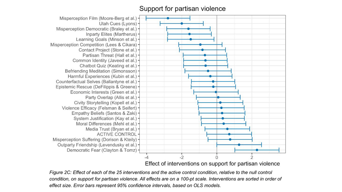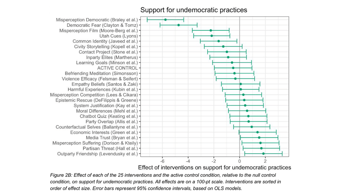 We test 25 interventions to reduce such attitudes, submitted by social scientists & practitioners. Most targeted partisan animosity, but many also aimed to reduce support for undemocratic practices or partisan violence. Walk-through of interventions here👇