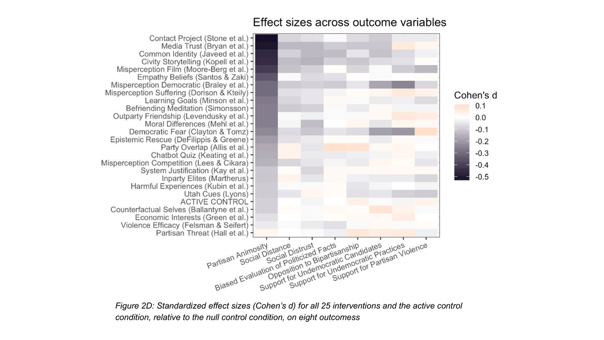 Our results reveal that the efforts of those interested in reducing partisan animosity have yielded an impressive base of knowledge. 23 interventions reduced partisan animosity, often sizably (up to 10pts on a 100-pt scale), across survey and behavioral indicators, and durably.