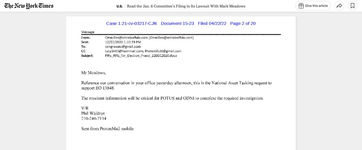 The NYT published an HJ6C filing confirming the Pentagon coup plot author—Flynn associate Waldron—returned to the WH with Powell the next business day after December 18, 2020, further establishing the plot didn’t end then.