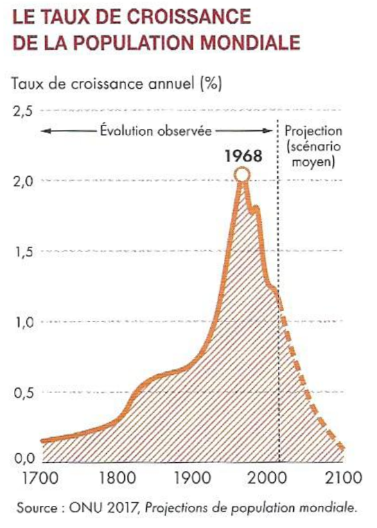 En ce qui concerne la population, on constate aussi une baisse de son taux de croissance : il est passé de 2% par an à la fin des années 1960 à 1% aujourd'hui. La démographie mondiale devrait redevenir stable au XXIIe siècle. 20/25