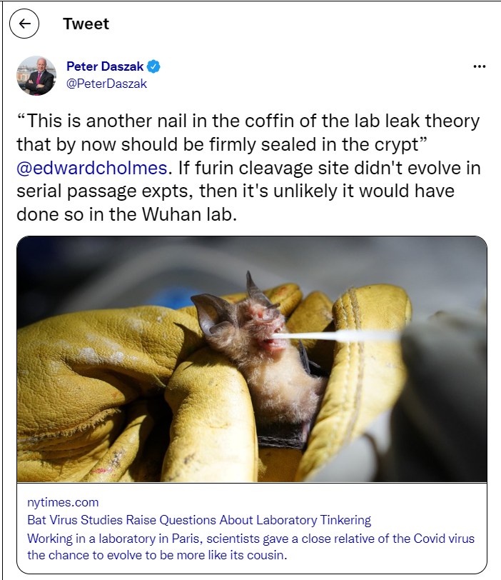 As published, the paper is now a damp squib. Gone is all the certainty of the preprint. Where the preprint claimed ‘dispositive evidence for the emergence of Sars-CoV-2’, the paper now cites ‘insufficient evidence to define upstream events’