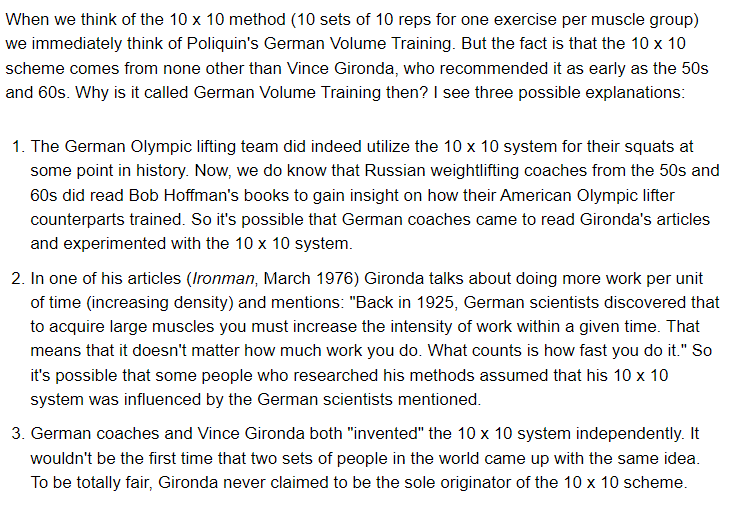 First, it's worth saying that Gironda may actually have come up with 10x10 training in the first place, and that the Germans learned about it from Vince indirectly. According to Christian Thibaudeau, there are three possibilities: