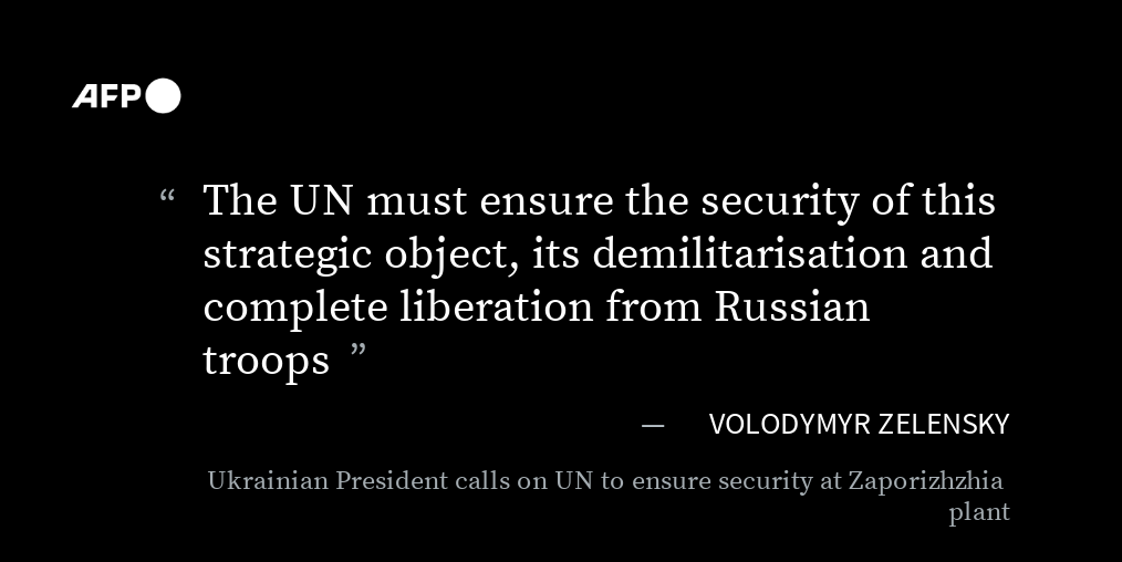 #UPDATE Ukrainian President Volodymyr Zelensky called on the United Nations to ensure security at the Zaporizhzhia power plant, where increased fighting has raised fears of a nuclear incident