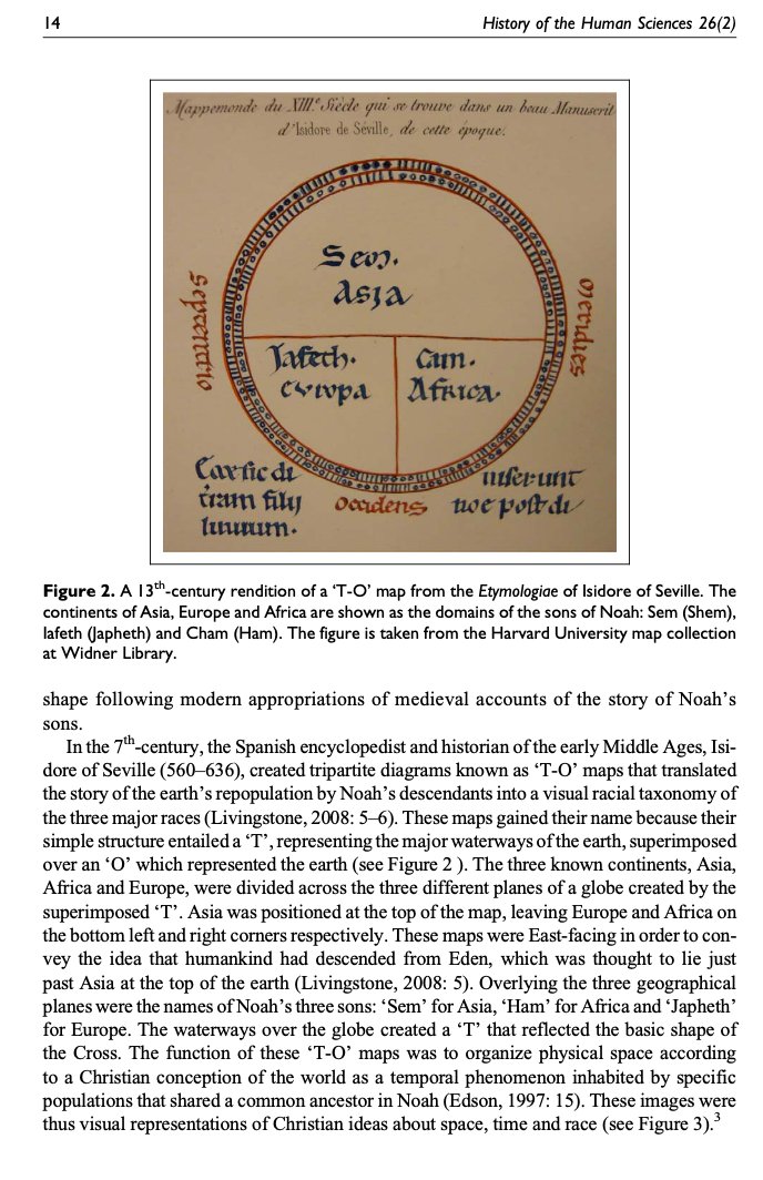 Also in the MA a dominant map of the world in Europe was the T-O map that associated 3 known continents--Africa, Europe & Asia--w/ Noah's 3 sons. This doesn't become racialized until after colonial era. Terrence Keel, "Religion, Polygenism & the Early Science of Human Origins":