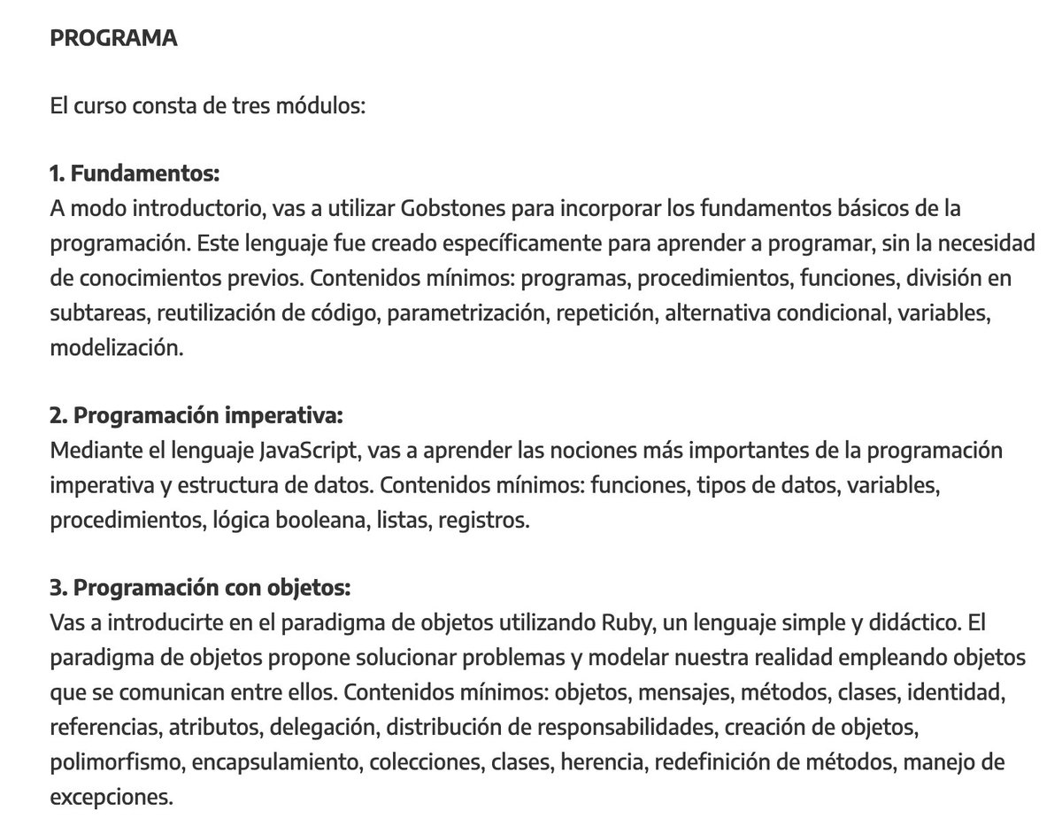 Otro recordatorio: la primera etapa incluye solo una plataforma de ejercicios online que "enseña" sin profesores a programar en 3 lenguajes durante 2 Meses: Gobstones, JavaScript y Ruby (🤌). Examen sin control de identidad que aprueba ~30%