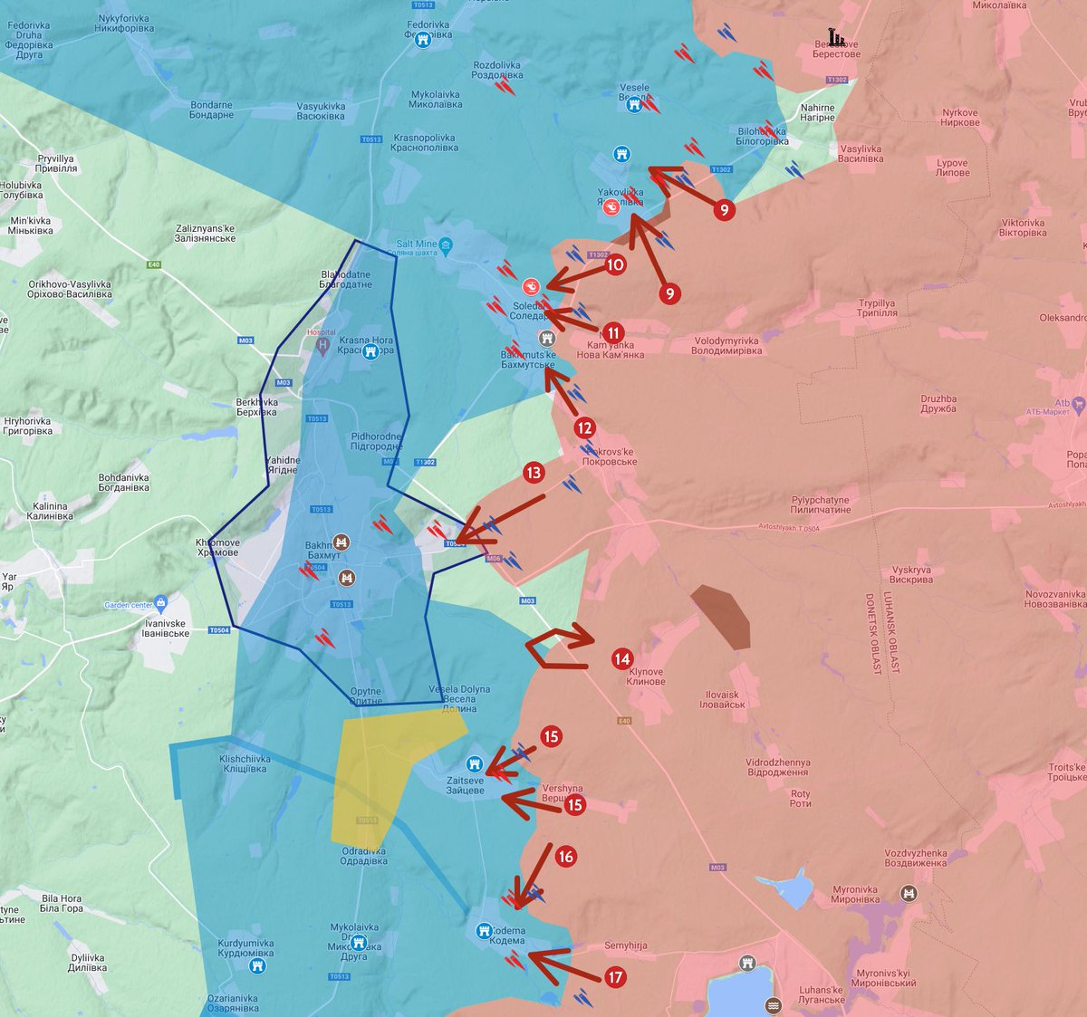 South of Bakhmut, Russians are trying to bypass Vesela Dolyna, which has proven to be heavily defended, by attacking directly towards Bakhmut from Klynove (14). Ukrainian defenders repulsed this attempt for the second day in a row.