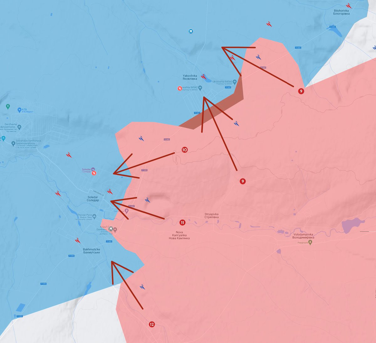 Russians are attacking Soledar from the east (10) and south (11). The attack from the east is the more significant threat to the town. There is heavy ongoing fighting, and there are rumors that Russia has captured several Ukrainian defensive positions, but without provided proof.