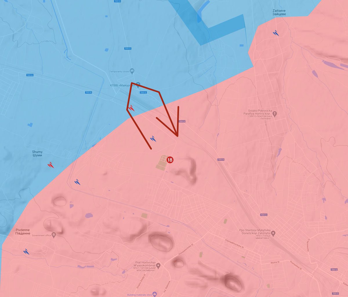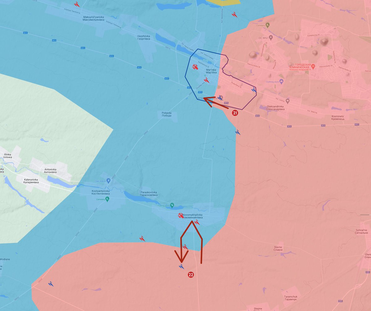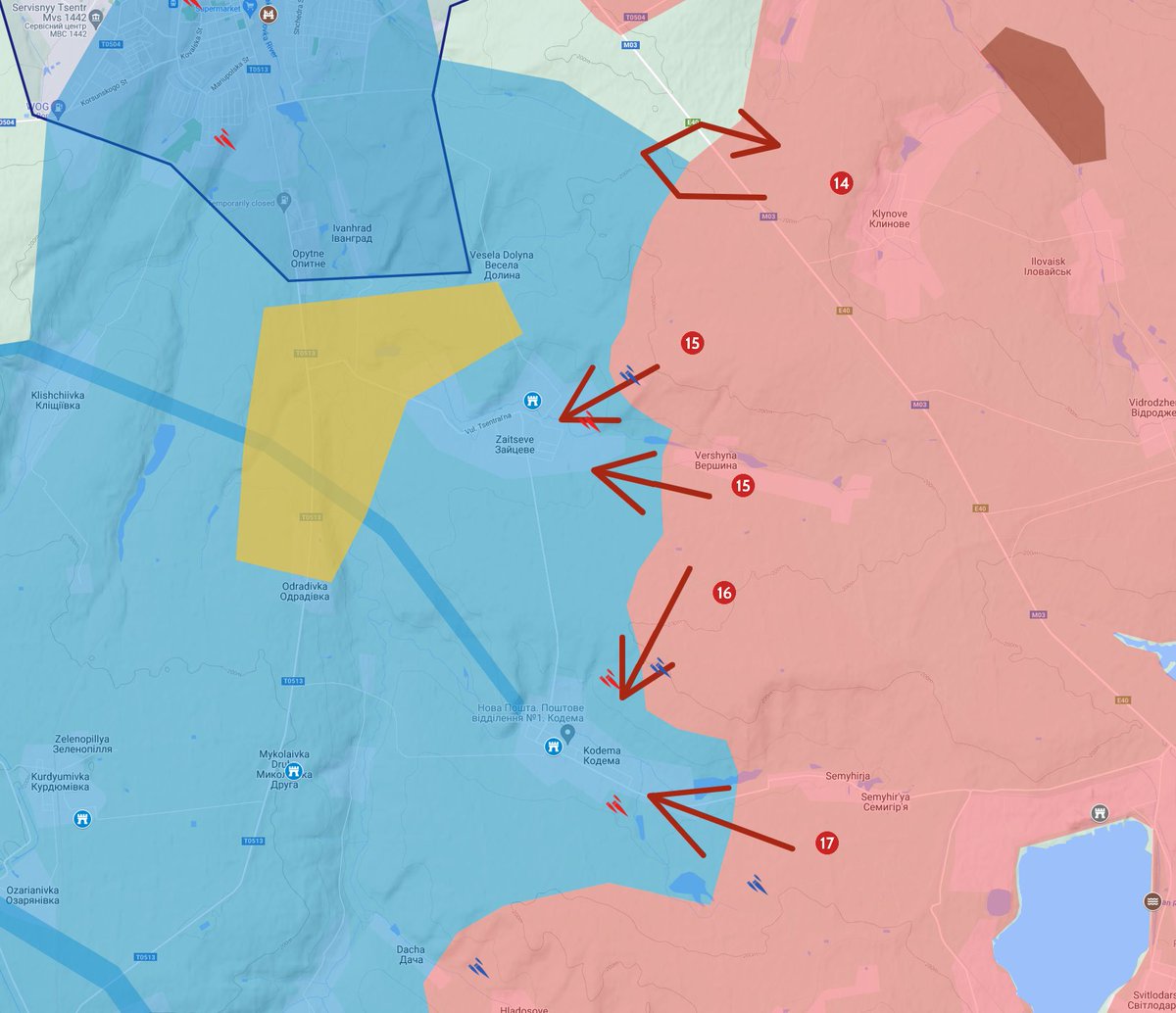 Today, Russia tried attacking Kodema from Vershyna (16), but the defenders repulsed the attack. They regrouped and attacked Zaitseve to the west instead (15). The fighting is ongoing.