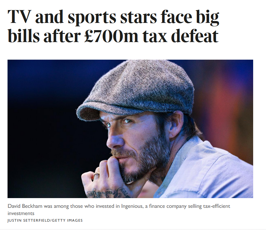 In 2016 David Beckham along w/ ..other celebs & City people found themselves in a bit of tax bother due to their investments in a controversial film investment scheme with Ingenious, a finance company selling tax-efficient investments in Hollywood films archive.ph/PeVT2