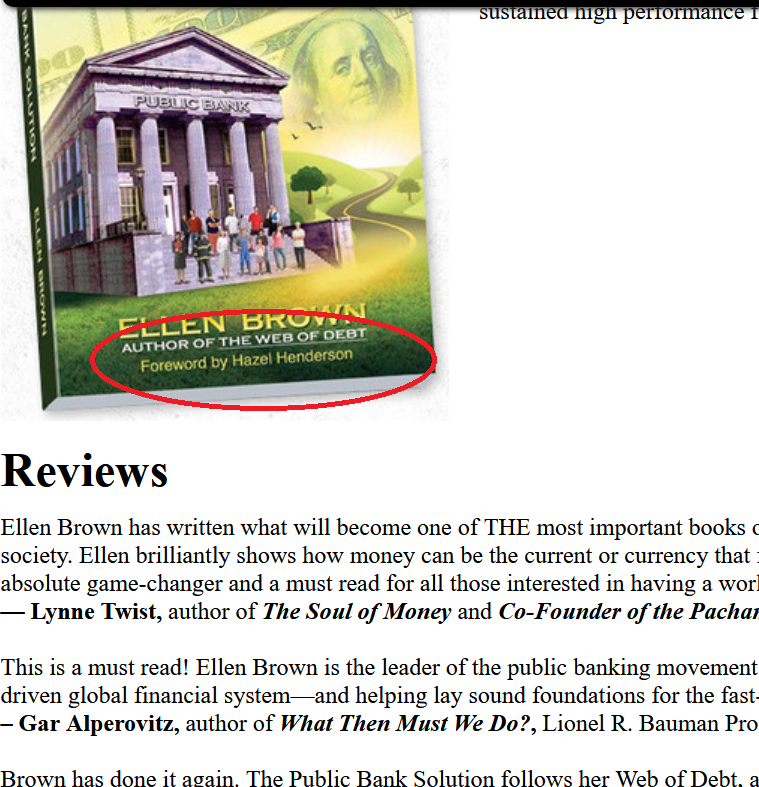 "In 2011, Brown founded the Public Banking Institute (PBI) to promote research and advocacy of public banks. In 2013, Brown published The Public Bank Solution, revisiting her arguments in Web of Debt "