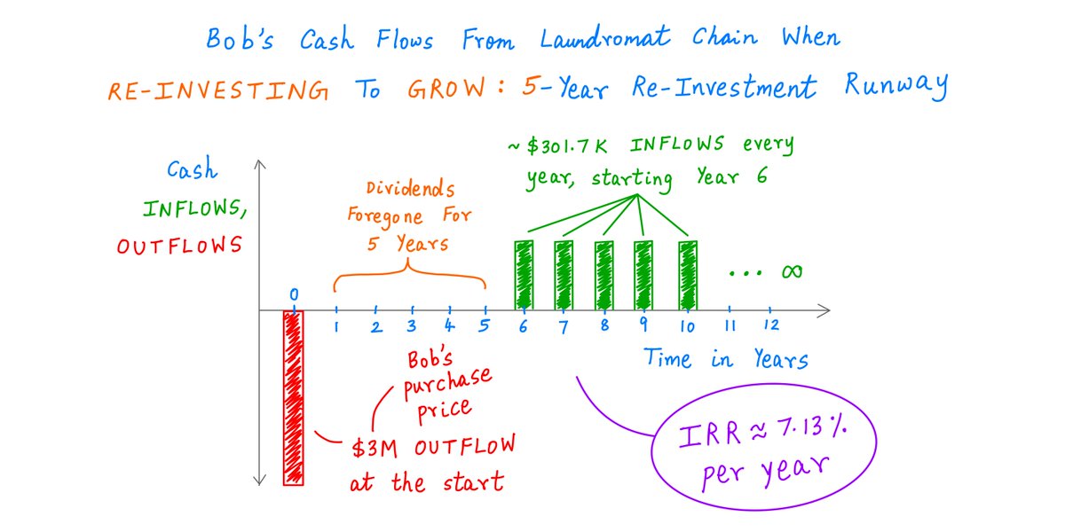 Thus, by foregoing dividends for 5 years and intelligently re-investing that money back into the business, Bob is able to boost his IRR from 5% to ~7.13% per year.