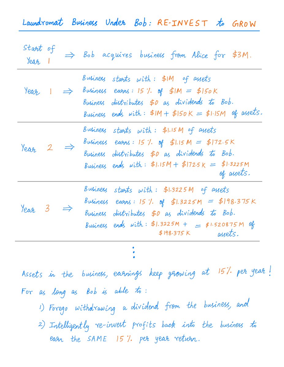 b) Able to intelligently RE-INVEST the "foregone dividend" money to GROW the business -- earning the SAME 15% on ALL new capital he's pouring into the business.