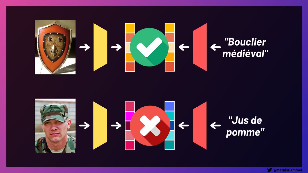 Je vous disais en début de thread que l'entraînement se fait traditionnellement en montrant au réseau des exemples d'entrées+sorties, ici c'est donc un peu différent : on présente deux entrées à CLIP, et on lui dit "débrouille-toi pour que leurs embeddings correspondent".