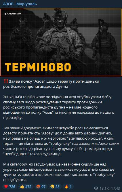 One of the official Azov Telegram channels denies knowing the woman and says that the assassination was a provocation to "prepare the Russian public for the trial against Azov members". Are they implying that before this Russians loved Azov? Lol Image
