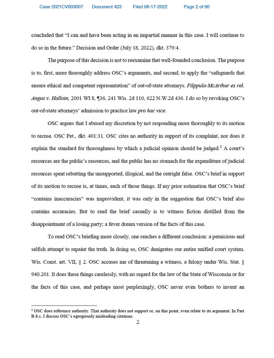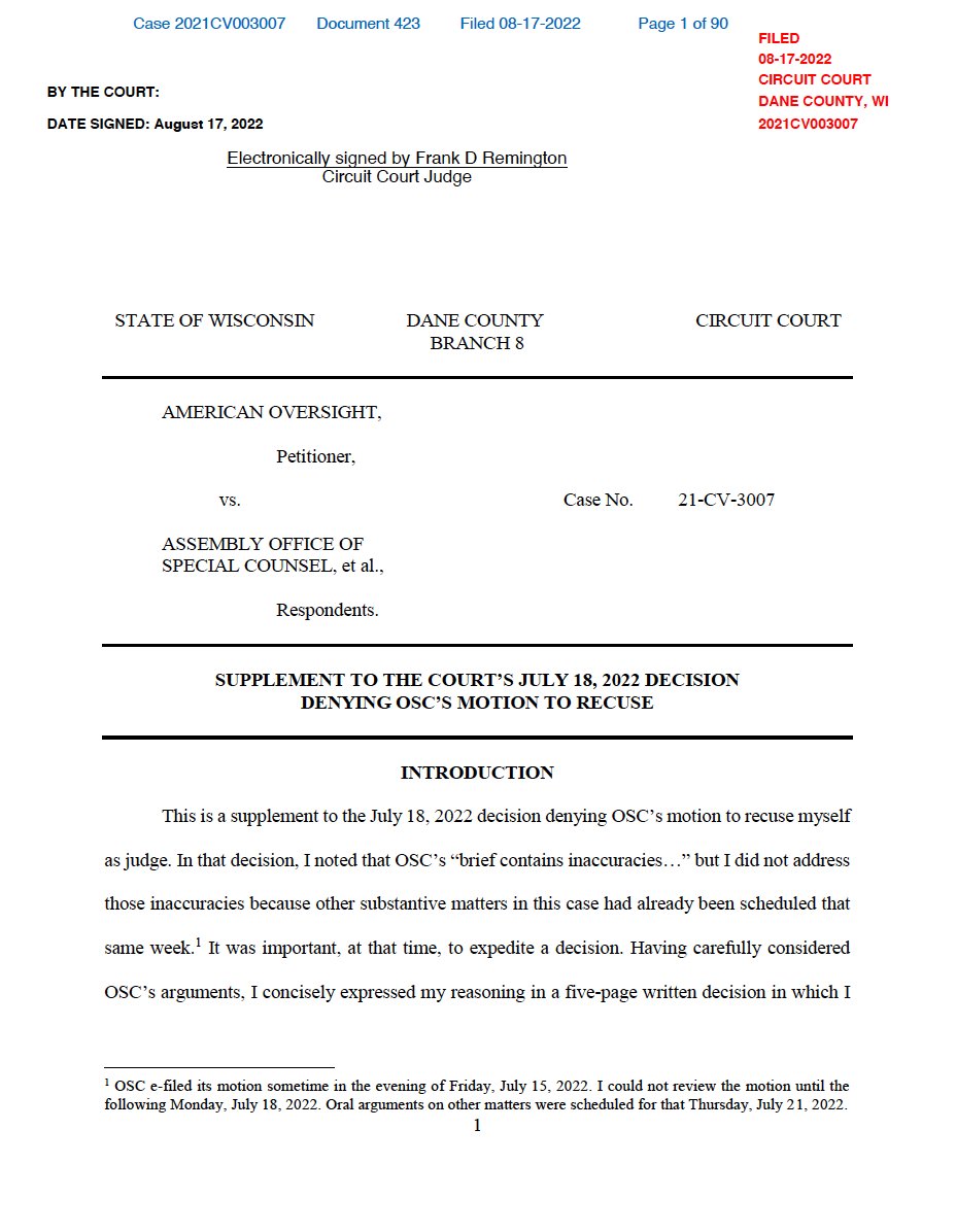 NEWS: In a ruling today, a Wisconsin judge found that the state assembly’s partisan election inquiry “accomplished nothing” for months — and revoked attorney James Bopp’s permission to represent the OSC in American Oversight’s ongoing lawsuit. americanoversight.org/wisconsin-cour…