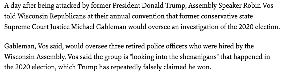 First, Wisconsin’s review of the 2020 election predated Gableman. On May 26, 2021, Speaker Vos announced that he would be hiring retired police officers to investigate the election. It was supposed to take three months. jsonline.com/story/news/pol…