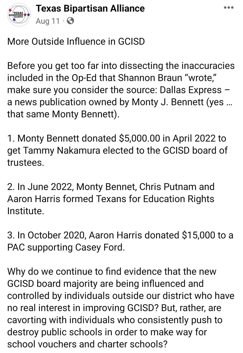 Here's a breakdown from @TexasBipartisan which spells out how Aaron Harris and wealthy hotelier Monty Bennett — who happens to be suing me for libel for an article about his newspaper that is factual — have formed an organization together and spent of money on these races.