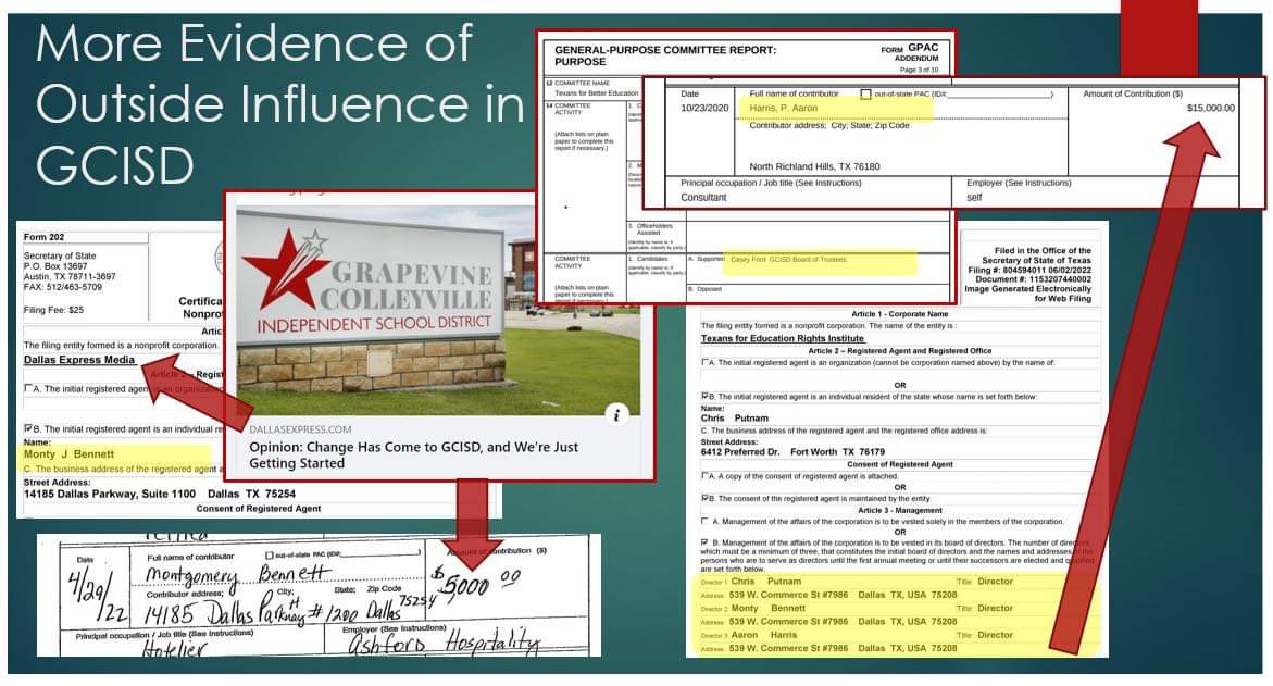 Something trustee St. John mentioned: GCISD hired a firm for legal advice. Same firm gave services to a right wing school board PAC in nearby Keller. Allegedly, theyve also worked for the largest donor to Ford, conservative political operative Aaron Harris who donated $15k