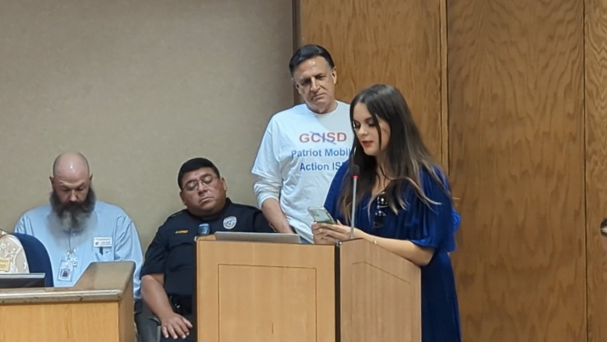 A man in a True Texas Project shirt who does not live in the district spoke in favor of the policies proposed by GCISD tonight. True Texas Project rallied for speakers to show up tonight. They're a far right group with a profile by @splcenter.