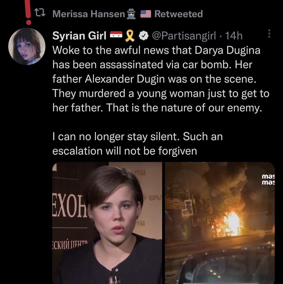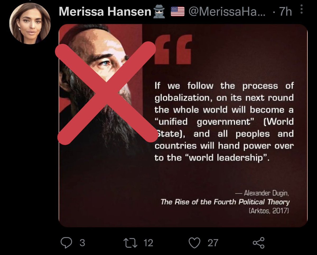 Alexander Dugin, who wrote a book that's been used by Russian military as a text book, is also the author of an essay promoting Russian fascism. He has a deep history of fascist political organizing. People like Merissa consider his enemies their enemies. en.m.wikipedia.org/wiki/Aleksandr…