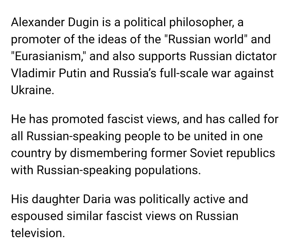 It should also be noted that Darya Dugin espoused similar fascist views as her father in Russian television, making her an active political participant in a fascist movement. It's still unclear who is responsible for the assassination. Ukraine denies involvement.