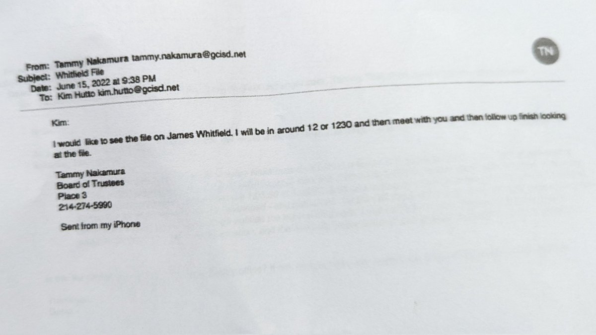 NOW: I just got a copy of an email acquired via a records request that shows recently elected GCISD school board member Tammy Nakamura specifically asked to see the HR file of fired principal @DrJamesWhit. In July, she bragged about accessing that file at a Republican forum.