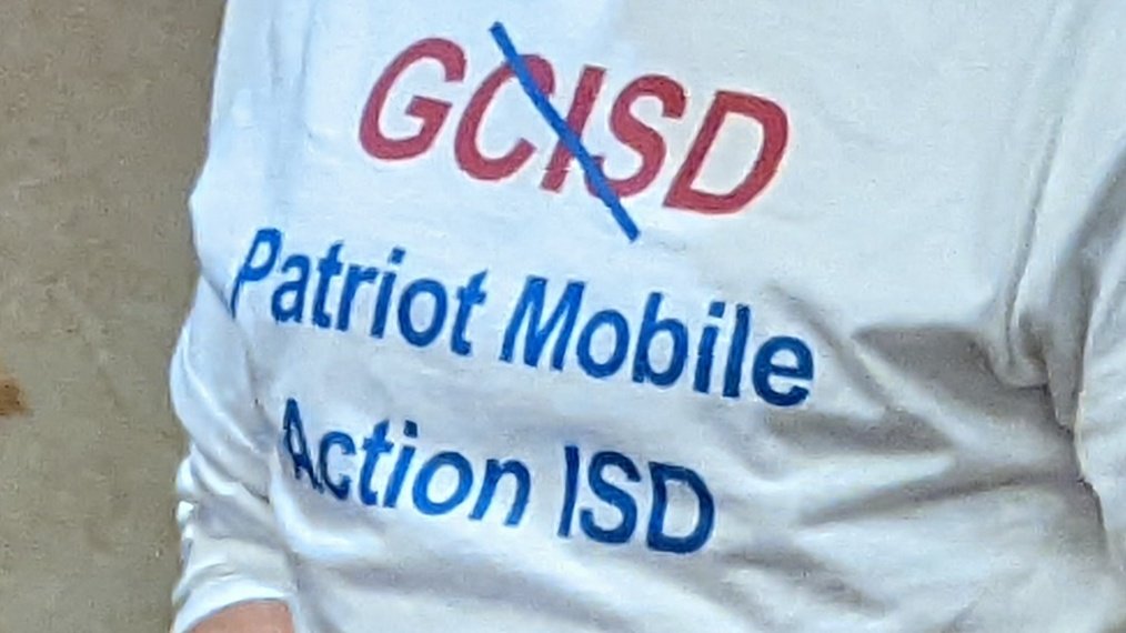 To clarify, the man in the shirt is actually opposed to Patriot Mobile. As noted by @Mike_Hixenbaugh, GCISD is crossed out, and replaced with Patriot Mobile Action ISD.