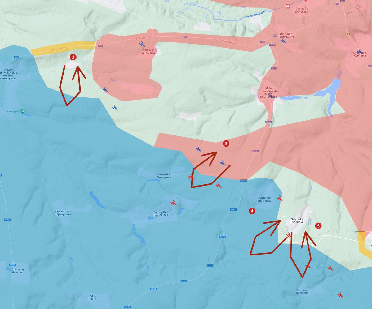 Russia is attacking in the direction of Kurdyumivka through Dacha (4) and attacking Mayorsk to the west (5). Mayorsk is a fortified train station.