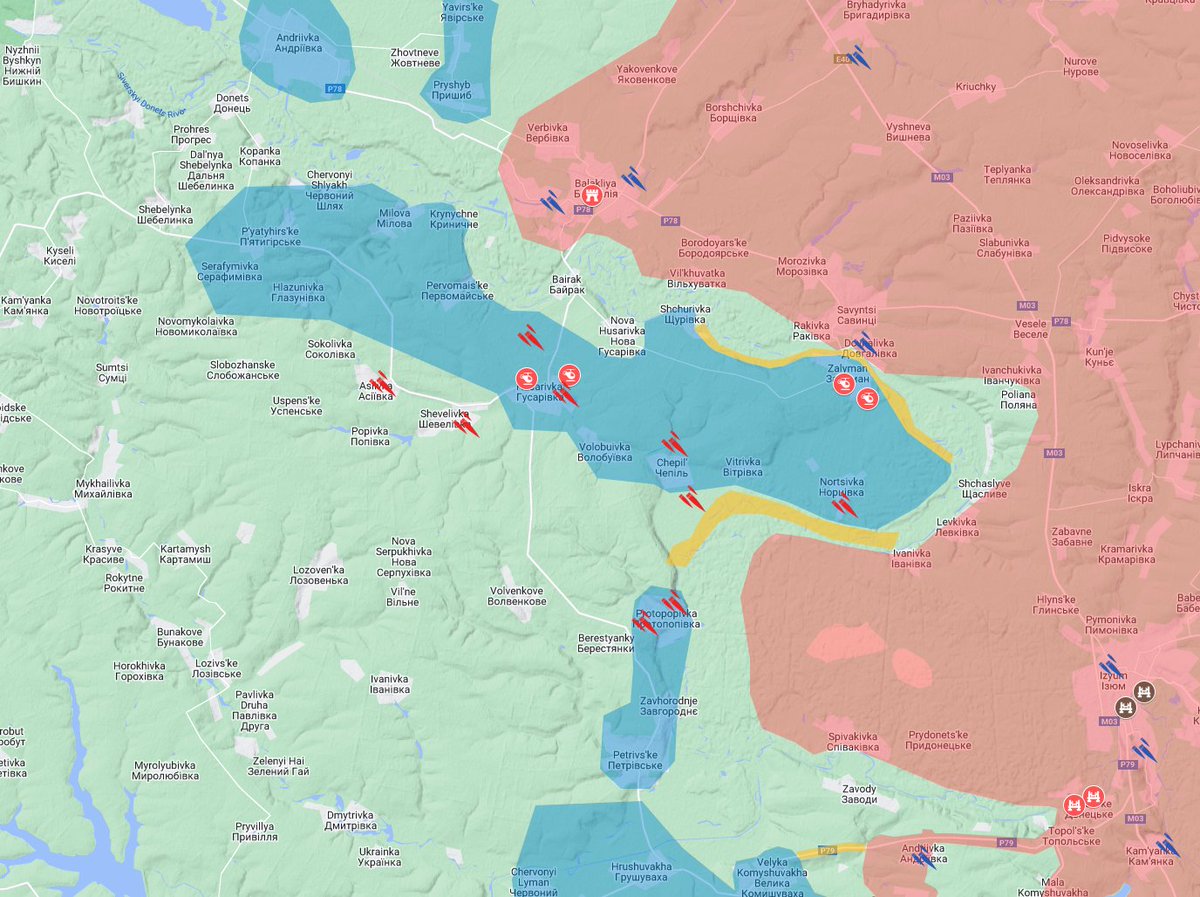 In the Izyum area, Russia is still trying to push south from Brazhkivka toward Nova Dmytrivka (1). I saw videos of Russian artillery strikes around Sulyhivka that reinforced my hesitation to mark Sulyhivka and Brazhkivka as Russian controlled. I believe both are gray areas.