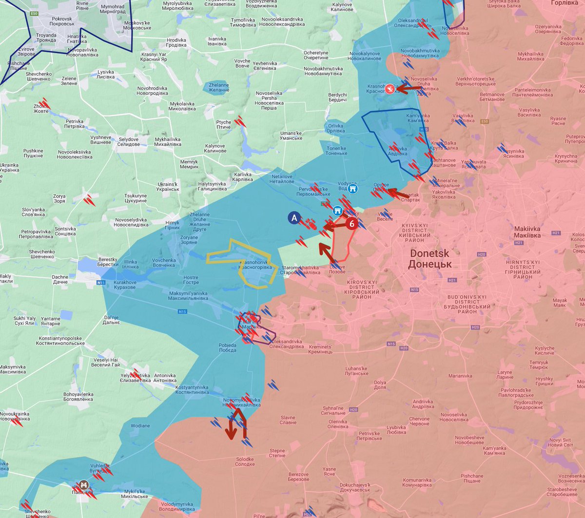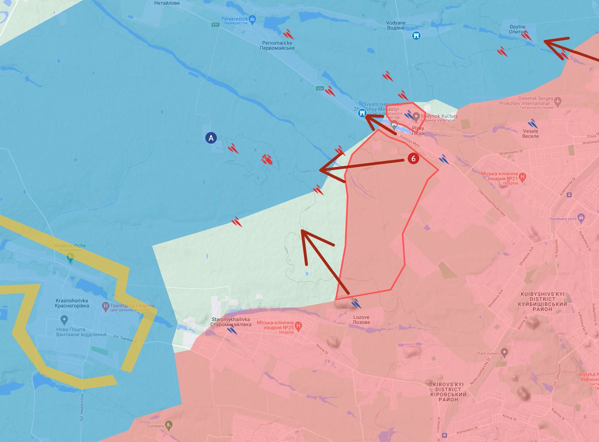 Russia captured significant ground west of Pisky and north of Lozove (6). They may have also captured territory north of Staromykhailivka, but I did not find confirmation. Russia seeks to capture the tiny town of Nevelske (A).