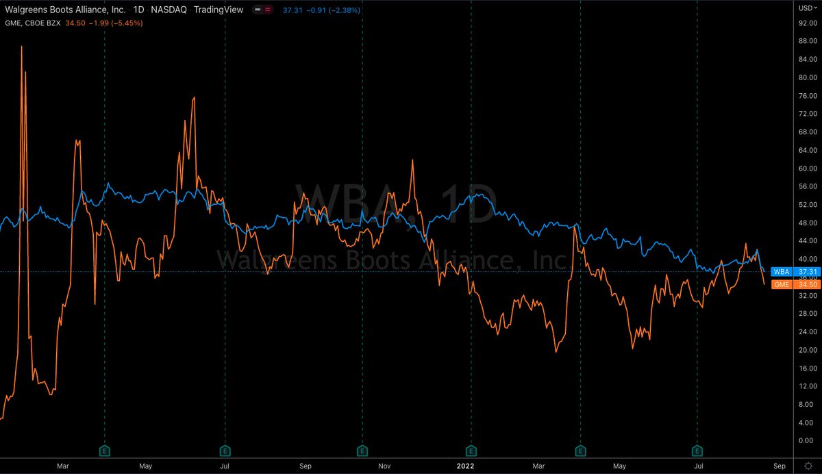 2- The best two candidates I found for this example are $GME to $WBA (since they are very close in price). Can you tell which one is more volatile?