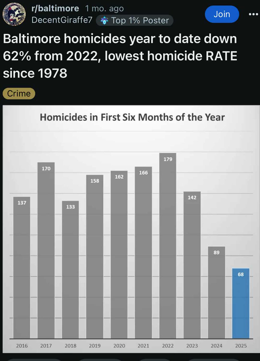 Baltimore mayor Brandon Scott has reduced his city's homicide rate by 62%. It hasn't been this low since 1978.