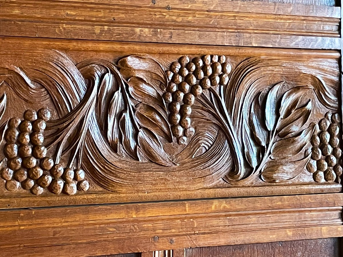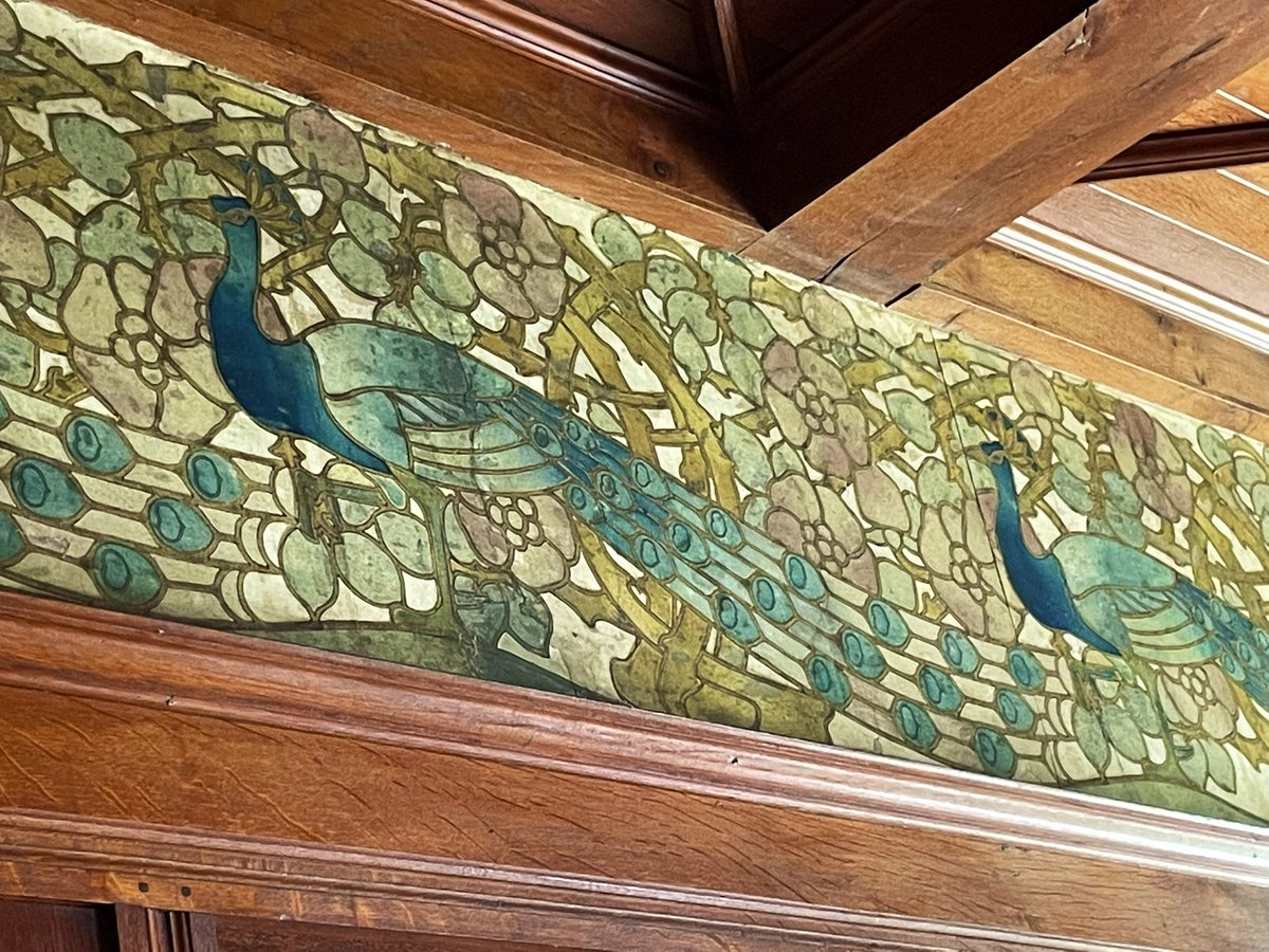 The exquisite carving has so many details. The wallpaper would have cost around £3 for this small handmade peacock strip (3x a week’s wages for an ordinary person at the time). The berries were the mulberry - from the family’s crest. It is found throughout the house.