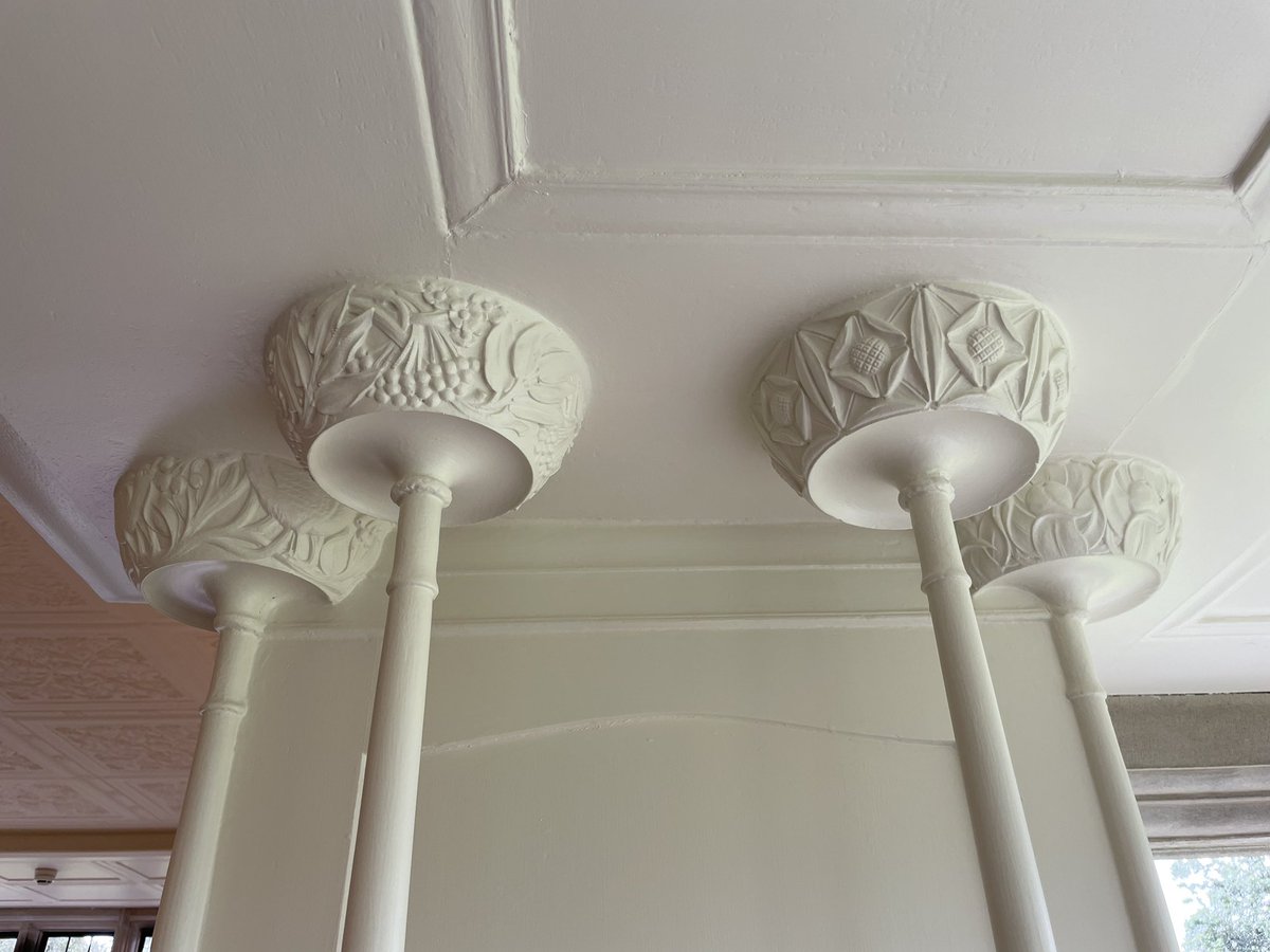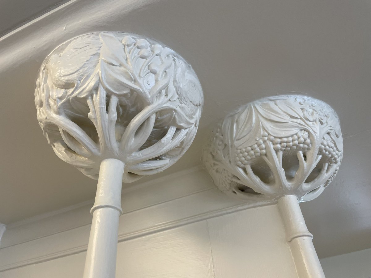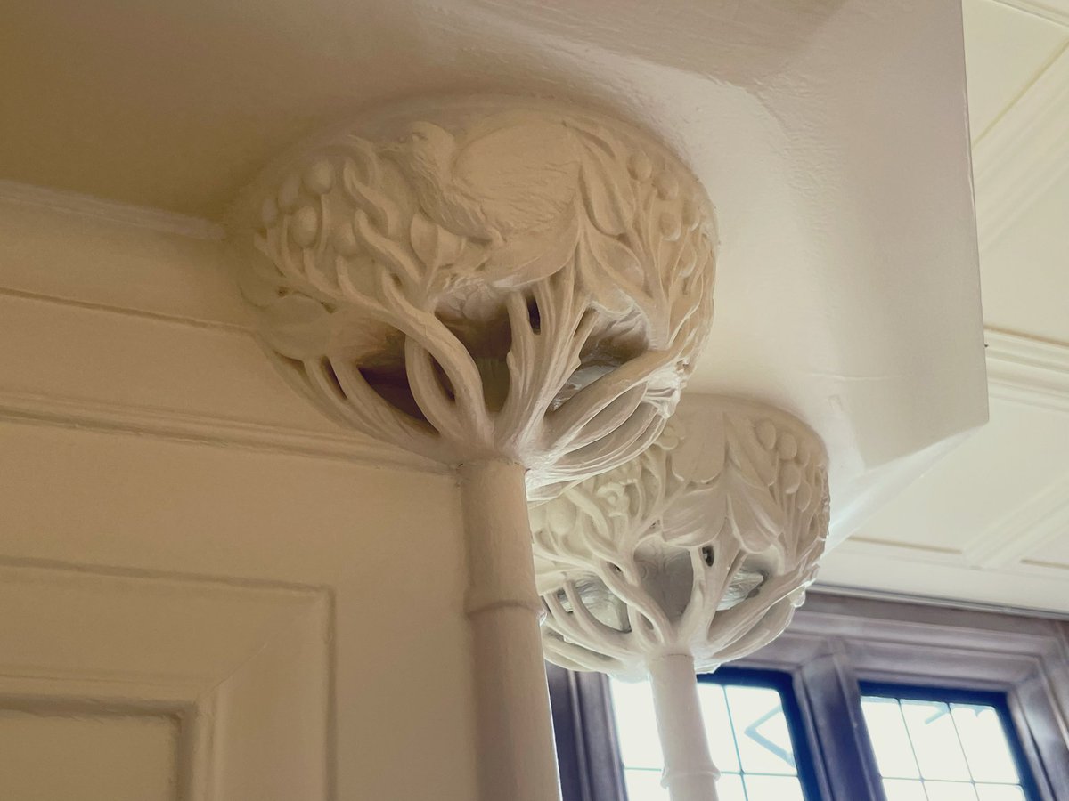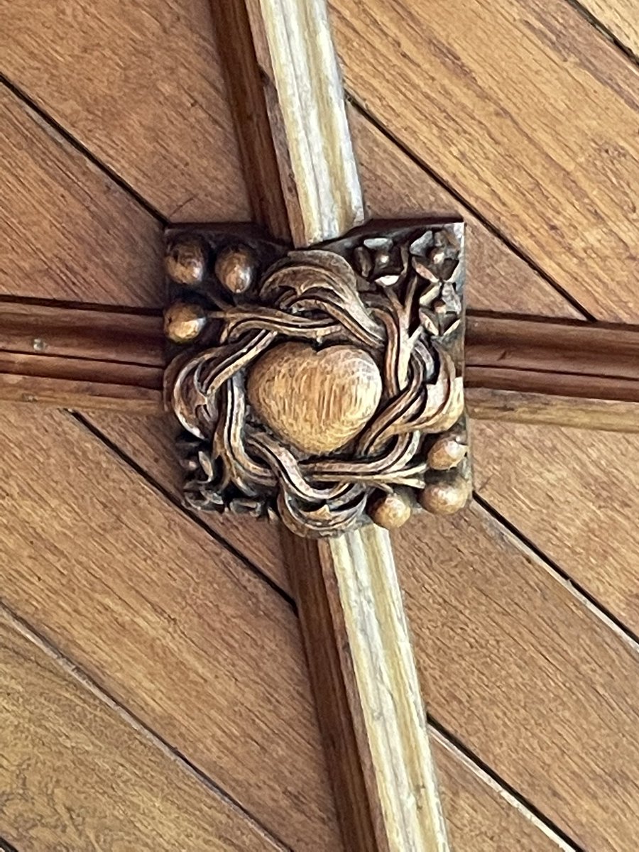The carved details are on both sides, including from the inside of the nooks. Each ceiling boss is different. The family were musical & this arts & crafts piano stands beside the stairs.