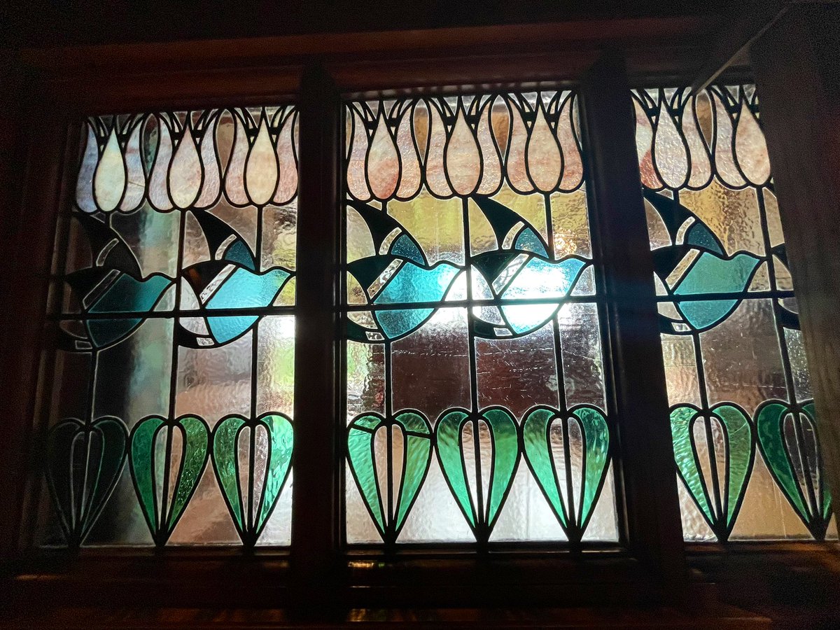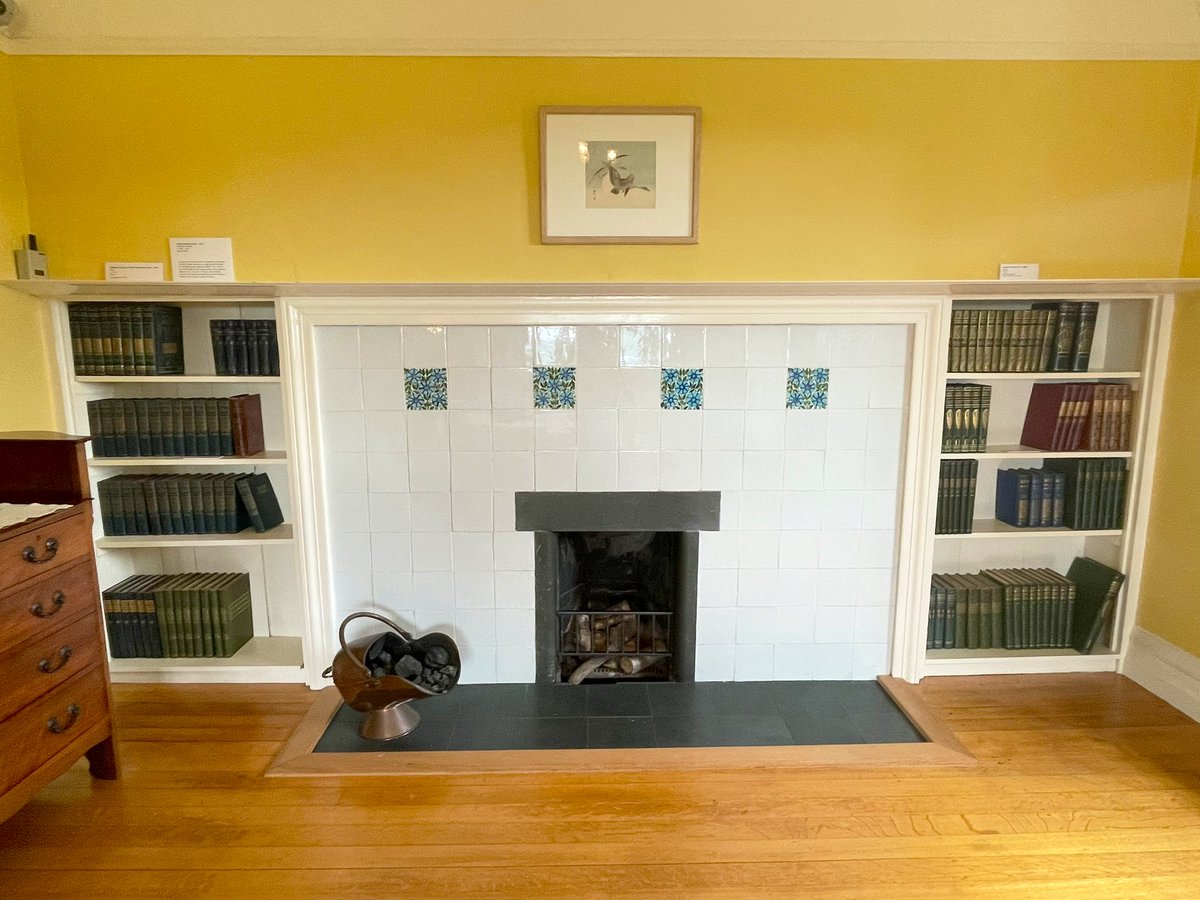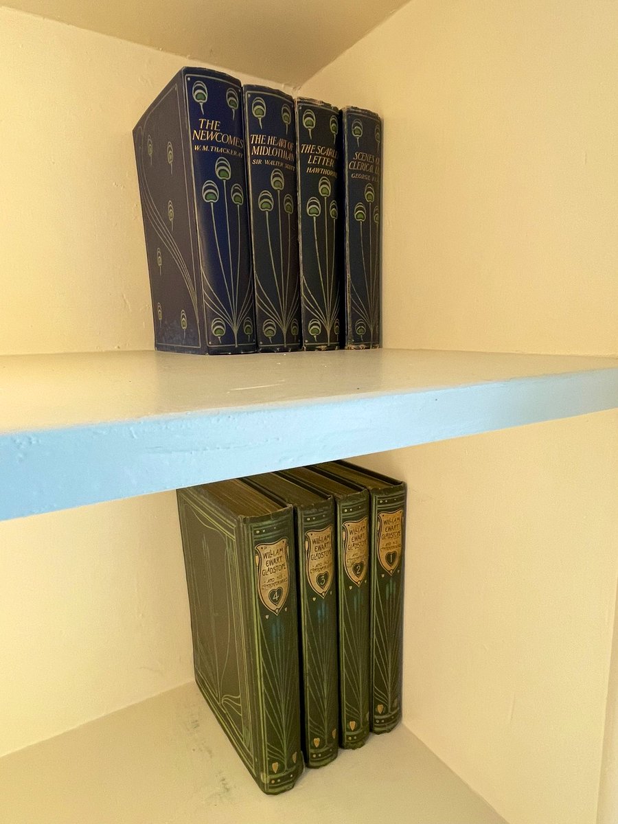 The books are all arts & craft designed bindings. Original stained glass windows throughout the house bring coloured light into the room, particularly next to fire places.