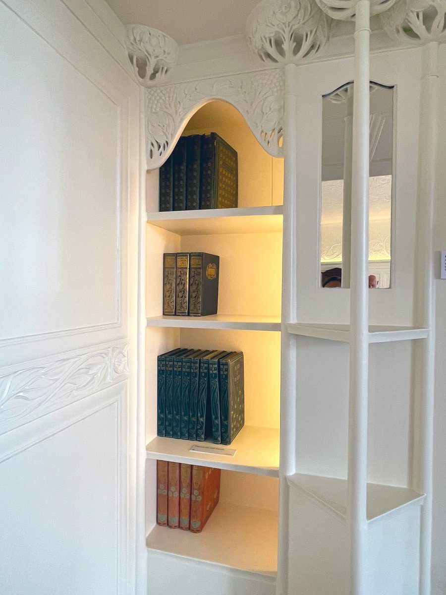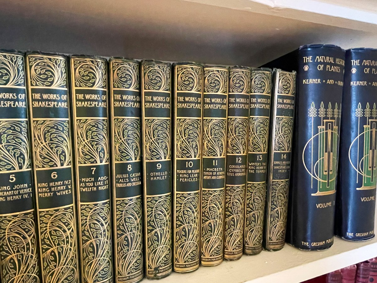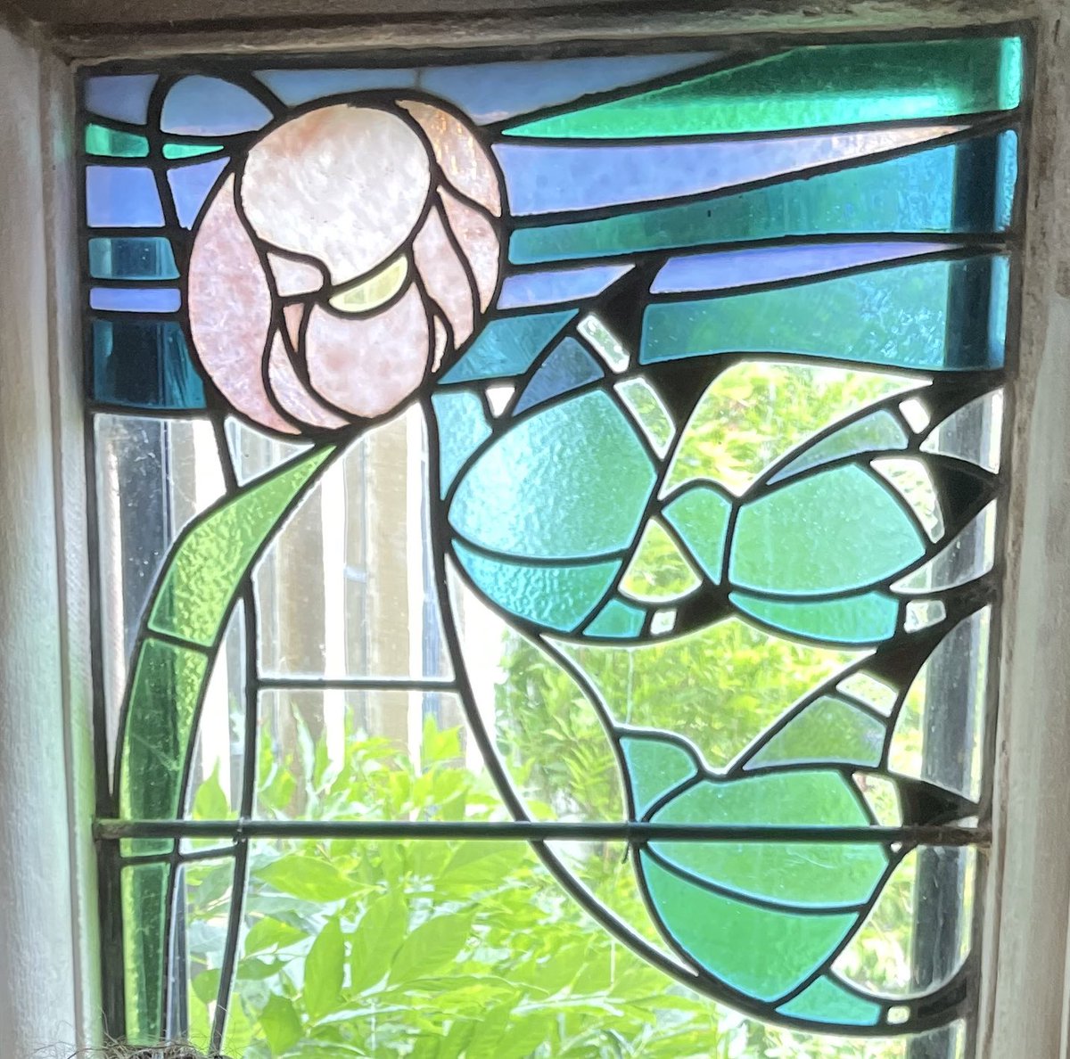 The books are all arts & craft designed bindings. Original stained glass windows throughout the house bring coloured light into the room, particularly next to fire places.